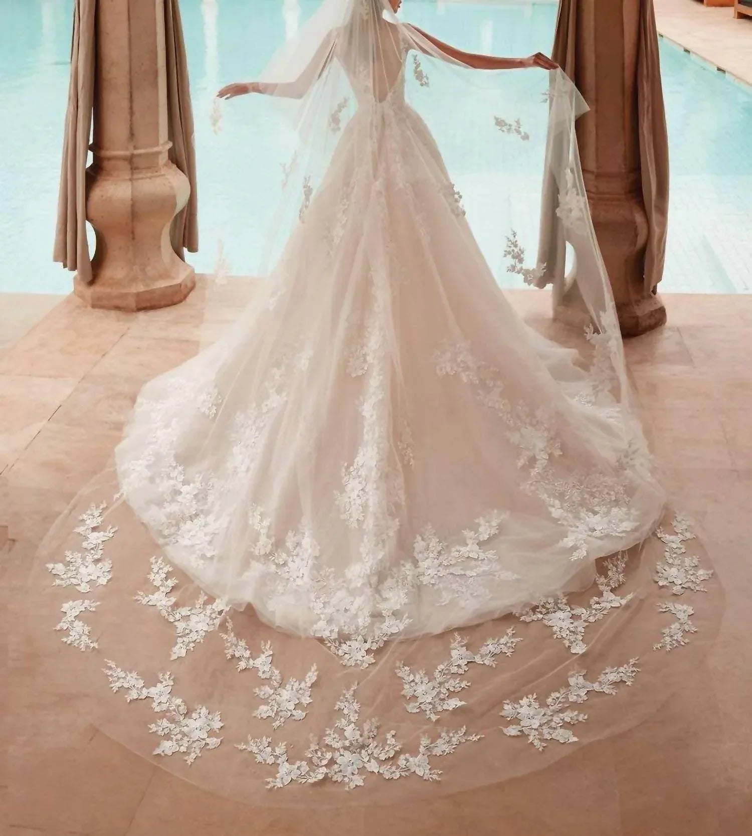 Step into elegance with the Beaded Lace Tulle Gown by Demetrios, expertly crafted for the discerning bride. This Ivory gown showcases a breathtaking sleeveless design with a plunging V-neckline and textured floral straps, flowing into a seductive low back. Made from exquisite beaded lace and sparkling tulle, the ballgown silhouette is completed with a luxurious cathedral train. Button closure.