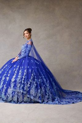 Command attention and grace in the La Valentina Quinceañera Ball Gown. This stunning gown features a sheer long-sleeve design with a sweetheart neckline and a flowing tulle cape, creating an elegant, ethereal look. The bustier corset ensures a flawless fit, while the cathedral-length cape adds drama and sophistication to every step. Available in striking Royal Blue and sizes XS–XL, La Valentina is the perfect choice for a Quinceañera who wants to feel regal, radiant, and unforgettable on her special day.