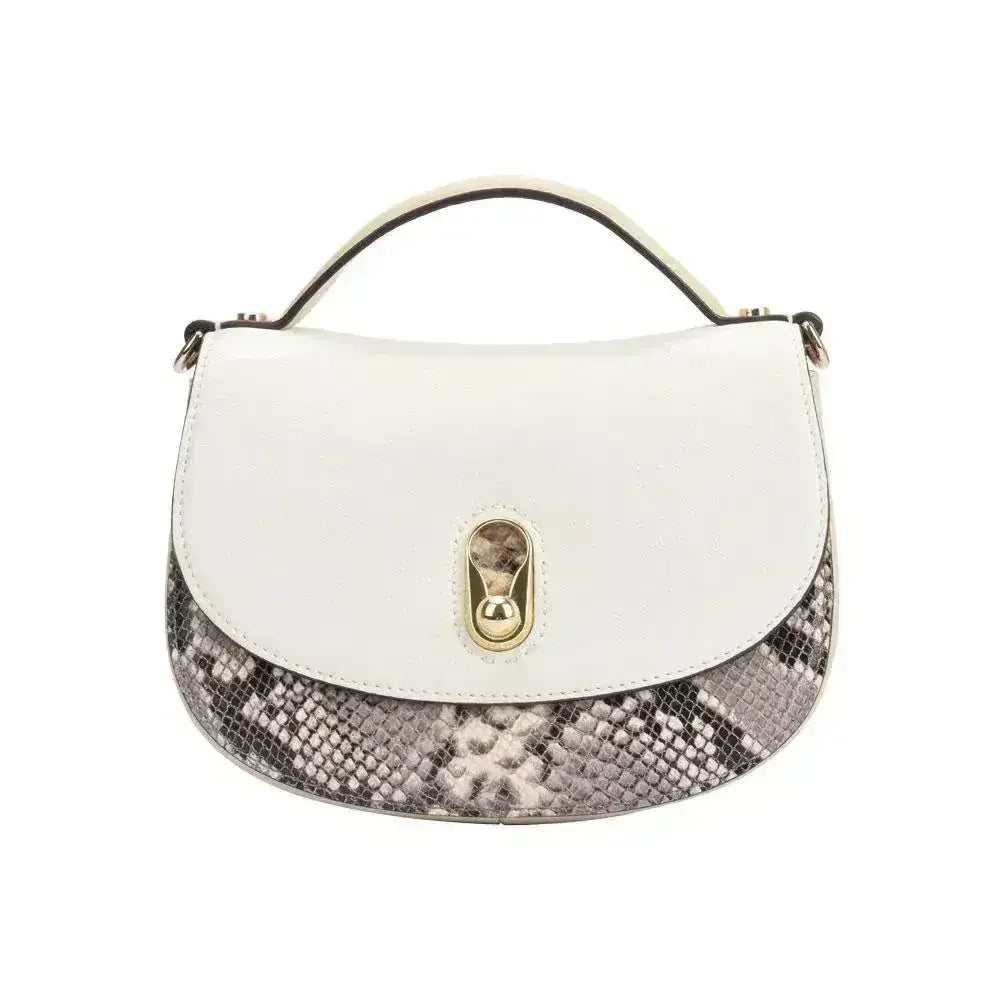 Smooth leather bag with short handle. Includes adjustable cross body/ shoulder strap. Main compartment with snake skin flap buckle. Silver metal detailing.