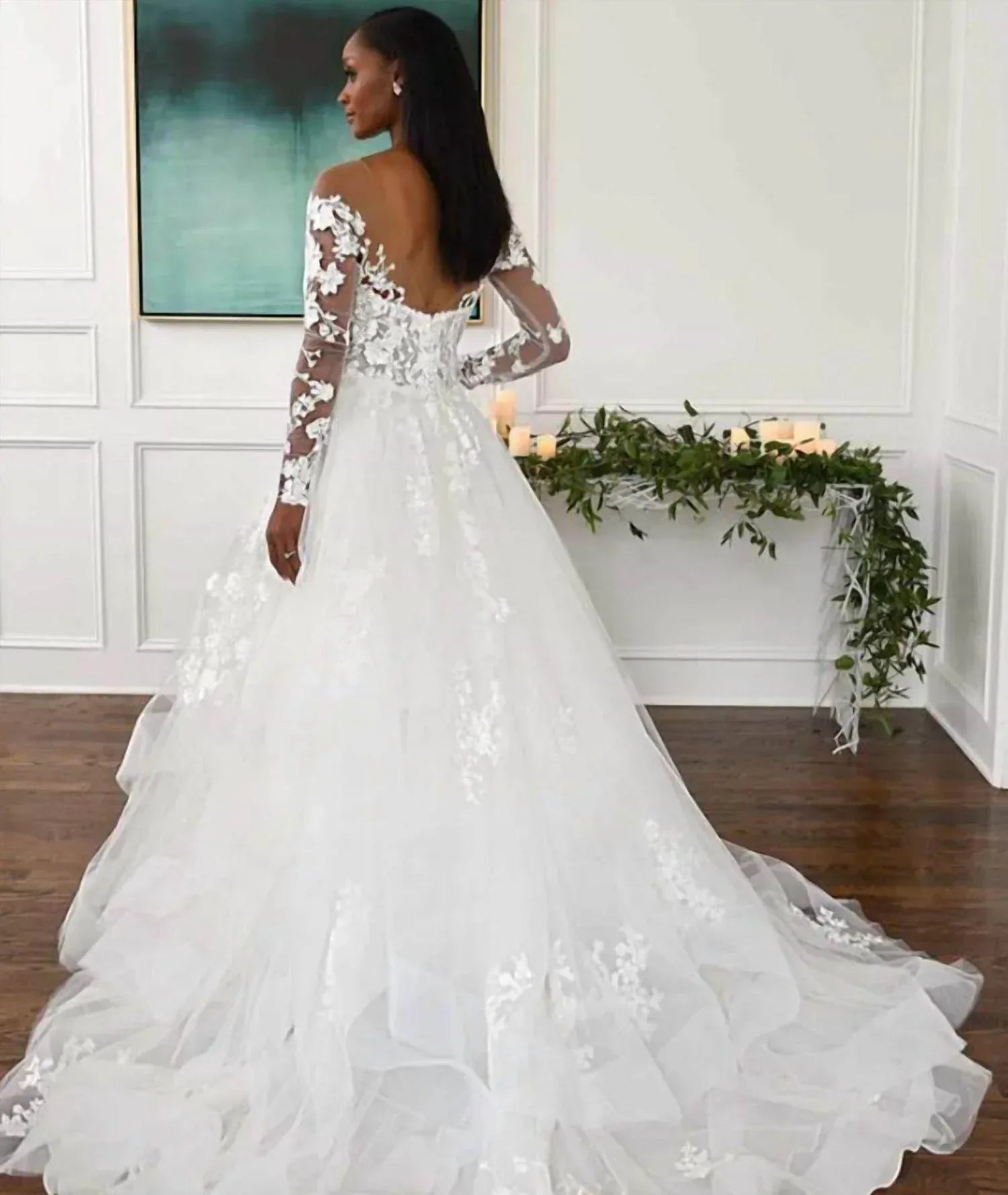 Delicate floral lace and sheer sleeves bring a fresh, romantic feel to this modern ballgown. An illusion off-the-shoulder neckline adds softness, while the tiered skirt with structured trim offers graceful volume. Sparkling accents and textured appliqués add a hint of drama to the overall look.